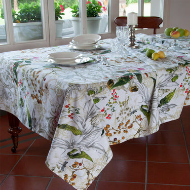 Tovaglia 8 Posti Rettangolare in Puro Cotone Fantasia Autunnale 140x230 cm - Bacche: la tovaglia bacche a 8 posti è ideale per arricchire la tua tavola con eleganza. Decorata con una raffinata fantasia floreale, presenta motivi botanici in delicati colori pastello su sfondo bianco. Perfetta per pranzi e cene in famiglia o eventi speciali, questa tovaglia unisce stile e funzionalità. La composizione in puro cotone garantisce un facile lavaggio e una notevole resistenza. Con questa tovaglia, potrai creare un'atmosfera raffinata e accogliente per la tavola della cucina, salotto o giardino.