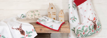 Coperte, cuscini e tovaglie a tema natalizio per un ambiente accogliente e festivo.