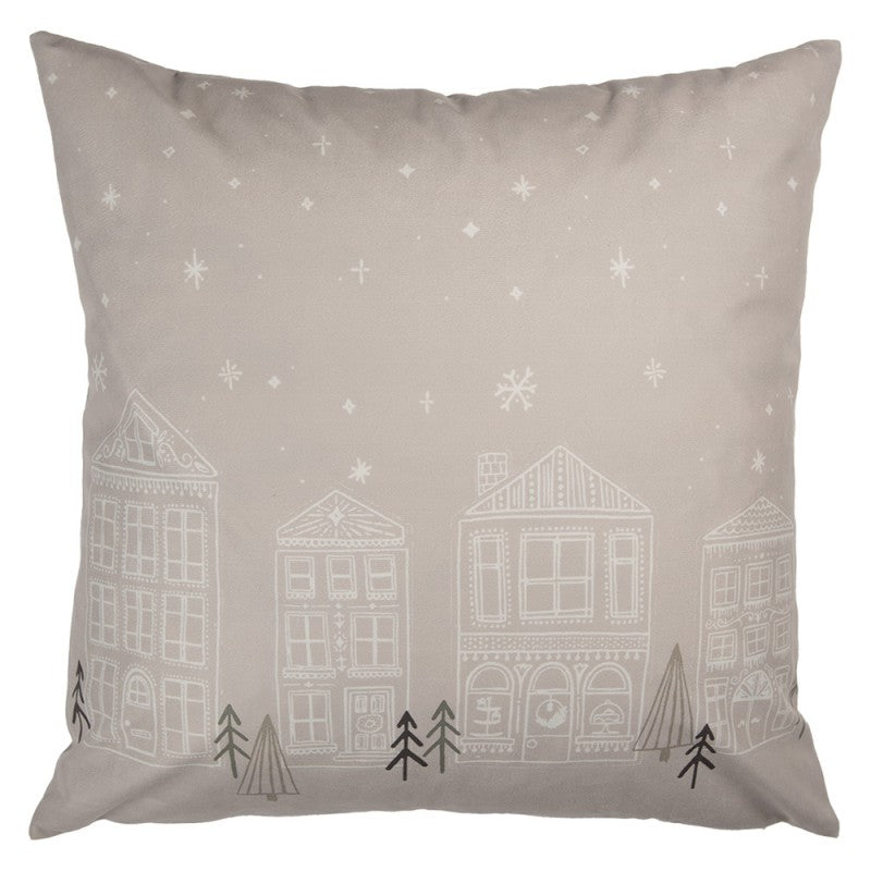 Crea un'atmosfera intima e sognante con questa federa per cuscino dal fascino invernale. Su un caldo sfondo beige, un delizioso paesaggio di casette stilizzate evoca la quiete e il comfort di un rifugio accogliente, portando in casa la magia silenziosa della stagione fredda.