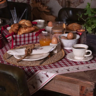 Crea una perfetta atmosfera natalizia con questa tovaglia in cotone. Il suo design tradizionale unisce un motivo a rombi rossi e beige con l'elegante figura di una renna, vestendo la tua tavola con stile e calore.