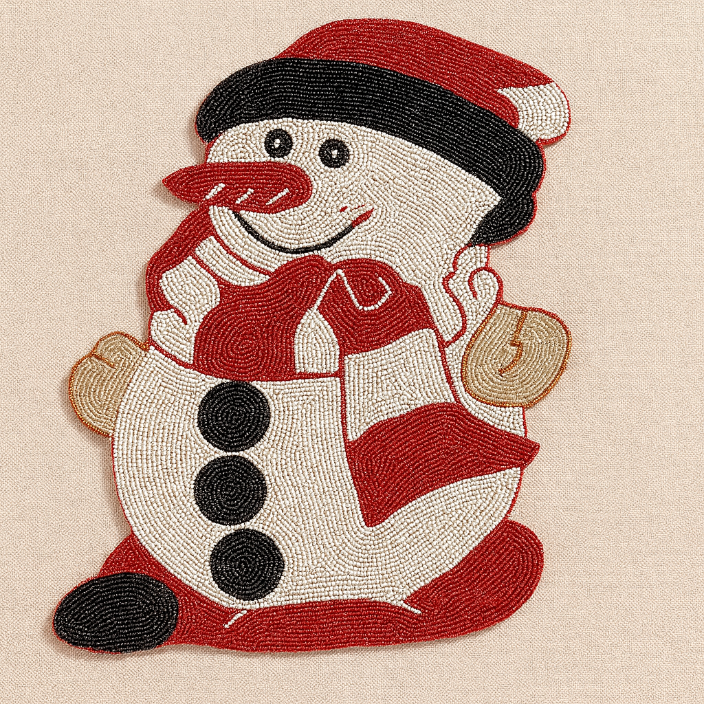 Porta l'allegria del Natale sulla tua tavola con questa deliziosa tovaglietta realizzata a mano. Un simpatico pupazzo di neve, protagonista del design, è interamente realizzato con perline multicolore applicate a mano su una base in cotone. Questa tecnica crea un disegno vivace, una texture unica al tatto e un bellissimo effetto scintillante. Con le sue dimensioni di 35x25 cm, è perfetta per la colazione delle feste, per servire una fetta di panettone o come allegro centrino decorativo. La lavorazione manuale assicura che ogni pezzo sia unico. Si consiglia di pulire delicatamente con un panno umido.