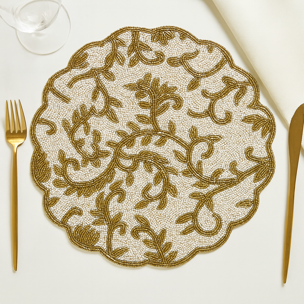 Arricchisci la tua mise en place con questa tovaglietta decorativa dal fascino classico ed elegante. Il tradizionale motivo broccato damascato, su una base in cotone bianco, crea uno sfondo di pura raffinatezza. L'intero disegno è delineato da preziose perline dorate, applicate minuziosamente per creare delicati punti di luce che catturano lo sguardo. Con le sue dimensioni di 35x35 cm, è una base perfetta per un coperto elegante. Realizzata a mano, l'unicità di ogni pezzo è garantita: nessuna tovaglietta è identica a un'altra. Si raccomanda il lavaggio a secco per proteggere la ricca applicazione di perline.