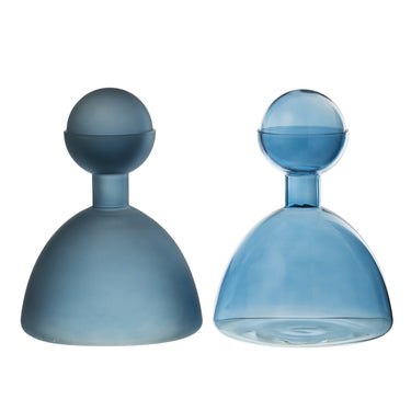 Set 2 Vasi Bottiglia Decorativi in Vetro Lucido e Opaco Blu h 20 cm: arricchisci il design della tua casa con questo esclusivo set di 2 vasi in vetro a forma di bottiglia, per decorare diversi ambienti della casa, dal salotto allo studio. Questo set è composto da due elementi, un vaso bottiglia marrone lucido, la cui superficie lucida cattura la luce, creando un punto luminoso e raffinato e un vaso bottiglia marrone opaco con finitura opaca, che offre un aspetto terroso e sofisticato, ideale per ambienti moderni o minimalisti. Entrambi i vasi sono dotati di tappo sferico, che permette di conservare al loro interno fiori secchi, sabbia colorata o altri elementi decorativi trasformando i due vasi in bottiglie decorative. Perfetti come centrotavola, decorazioni per mensole o come elementi distintivi in qualsiasi spazio, questo set presenta una tonalità di blu intenso e fresco che si adatta a stili di arredamento moderni.