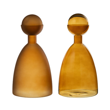 Set 2 Vasi Bottiglia Decorativi in Vetro Lucido e Opaco Marrone h 27 cm: arricchisci il design della tua casa con questo esclusivo set di 2 vasi in vetro a forma di bottiglia, per decorare diversi ambienti della casa, dal salotto allo studio. Questo set è composto da due elementi, un vaso bottiglia marrone lucido, la cui superficie lucida cattura la luce, creando un punto luminoso e raffinato e un vaso bottiglia marrone opaco con finitura opaca, che offre un aspetto terroso e sofisticato, ideale per ambienti moderni o minimalisti. Entrambi i vasi sono dotati di tappo sferico, che permette di conservare al loro interno fiori secchi, sabbia colorata o altri elementi decorativi trasformando i due vasi in bottiglie decorative. Perfetti come centrotavola, decorazioni per mensole o come elementi distintivi in qualsiasi spazio, questo set presenta una tonalità di marrone calda e accogliente che si adatta a stili di arredamento moderni.