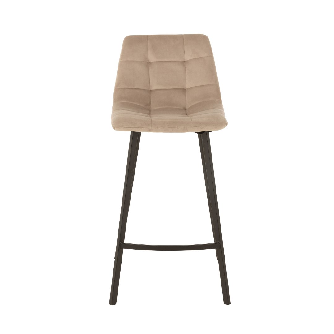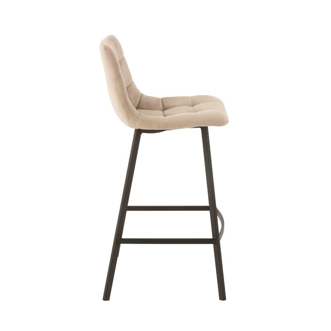 Sgabello Alto con Seduta in Velluto Capitonné Beige e Struttura in Metallo Nero: crea un'atmosfera accogliente con questa seduta dal design semplice ma affascinante. La struttura realizzata in metallo, offre una solida base su cui sedersi comodamente mentre lo schenale dall'effetto in velluto e ben imbottito, garantisce comfort e comodità. La combinazione dei colori nero e beige si abbina perfettamente a diversi tipi di arredamento regalando all'ambiente una nota di stile moderno.