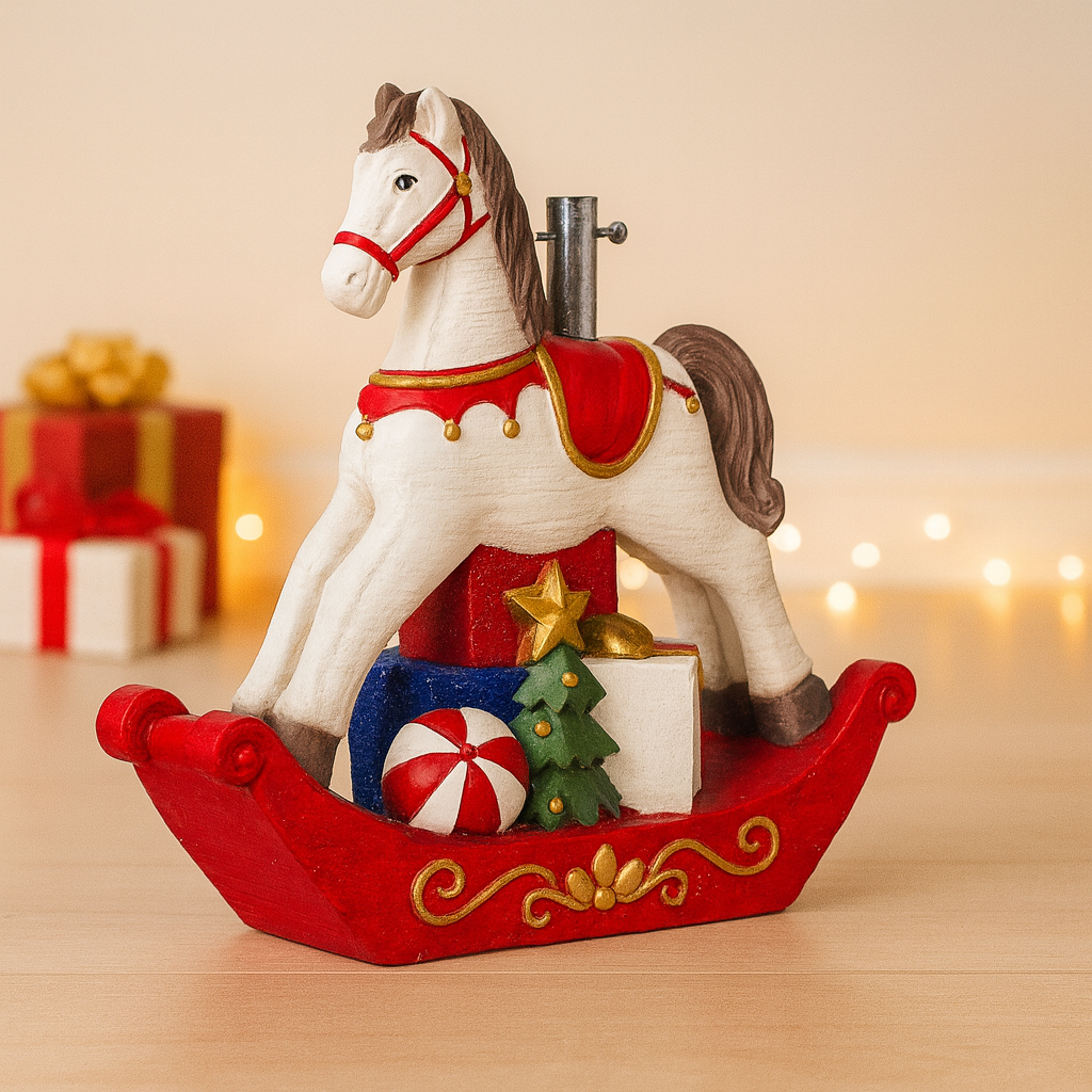 Aggiungi originalità al tuo albero di Natale con la Base Albero Cavallo a Dondolo in Ceramica Bianco e Rosso. Questa base decorativa raffigura un affascinante cavallo a dondolo, simbolo di tradizione e magia natalizia, realizzato con cura nei dettagli. Il cavallo, in un raffinato color bianco con accenti rossi, dona un'atmosfera natalizia al tuo ambiente. Perfetta per chi desidera una decorazione dallo stile classico ma ricercato.