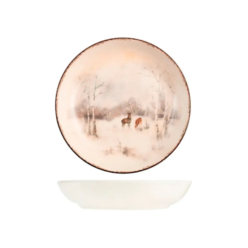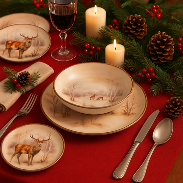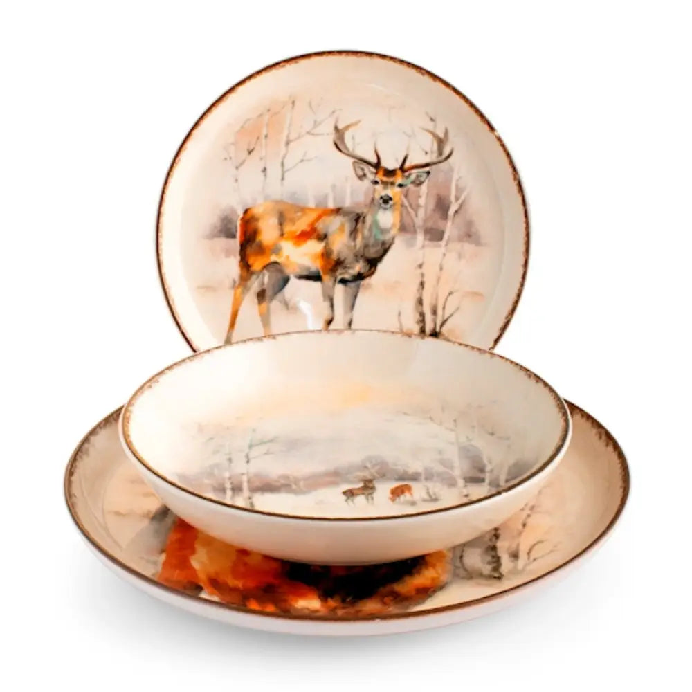 Questo servizio da 18 pezzi è un invito a celebrare la stagione più accogliente dell'anno. Su ogni piatto, eleganti cervi si muovono in un paesaggio stilizzato, evocando la quiete di un bosco innevato e l'incanto delle feste. Realizzato in stoneware, questo servizio abbina la sua bellezza a una piacevole sensazione di calore e solidità, ideale per le zuppe calde e i ricchi piatti della tradizione natalizia. Il set completo per sei persone include sei piatti piani, sei piatti fondi e sei piatti da frutta. E quando la festa è finita, la praticità prende il sopravvento: ogni pezzo è idoneo al lavaggio in lavastoviglie e all'uso nel microonde, per farti godere i momenti in famiglia in totale serenità.