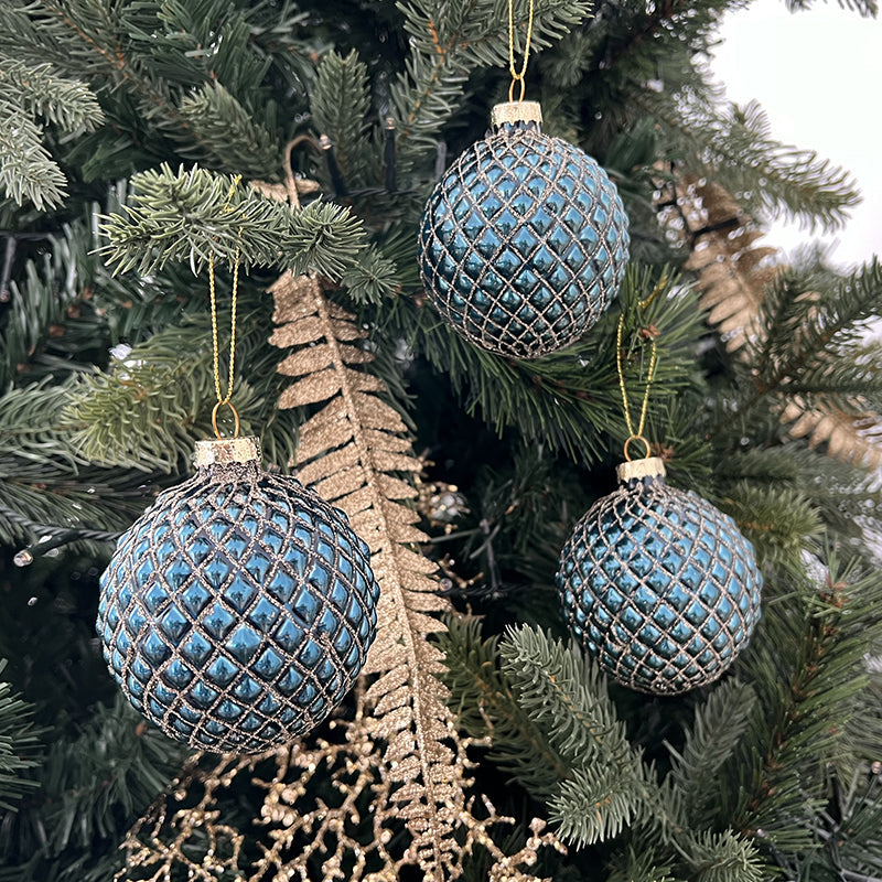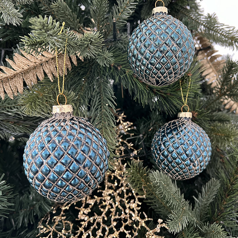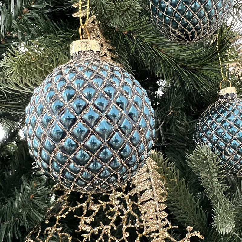 Set di 12 palle di Natale in vetro, diametro 8 cm, colore blu con dettagli in glitter e argento. Perfette per decorare l'albero di Natale, queste sfere aggiungono un tocco di eleganza festiva, brillando splendidamente tra le luci. Ideali per un'atmosfera natalizia raffinata e luminosa.
