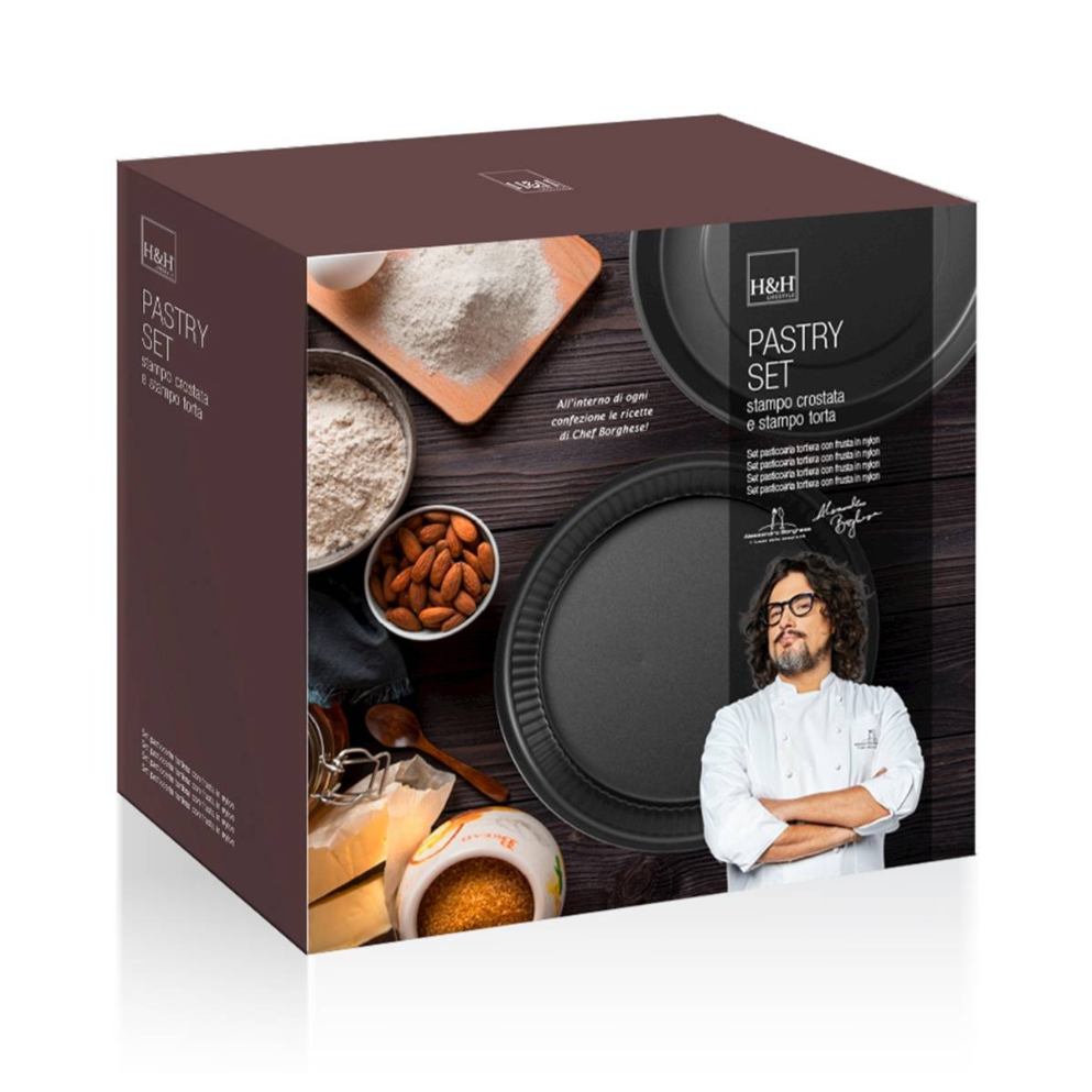 Set 2 Stampi Torta e Crostata in Acciaio HiTop - Alessandro Borghese: immergiti nel mondo della pasticceria con il set di 2 stampi dolce di Alessandro Borghese: 1 stampo crostata Ø 28 cm x h 4 cm e 1 tortiera liscia Ø 28 cm x h 5 cm. Con il loro rivestimento antiaderente e realizzati in acciaio Hi-Top, questi stampi promettono risultati di cottura impeccabili e un'anti-aderenza superiore, sostenendo una temperatura massima di 230°. Alessandro Borghese, sinonimo di lusso e semplicità in cucina, ha personalmente curato ogni dettaglio di questo set. E per rendere la tua esperienza ancora più ricca, all'interno di ogni confezione troverai ricette esclusive e consigli del celebre chef. Questo set è l'acquisto perfetto per te o un'idea regalo per un amico appassionato di cucina!