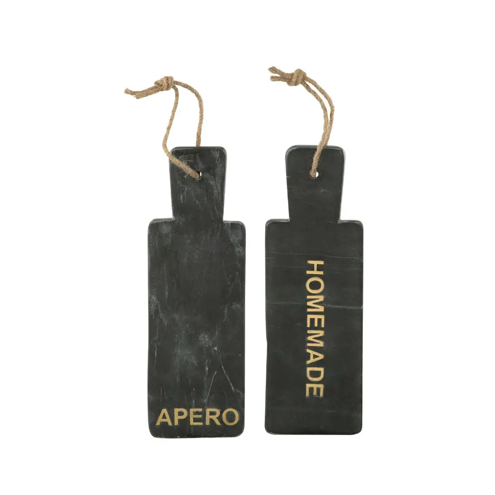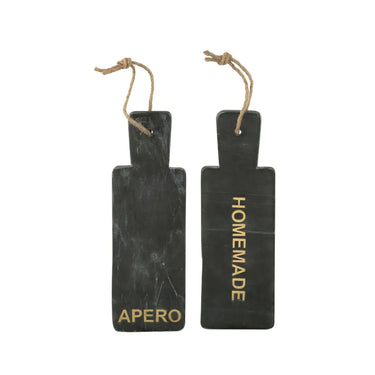 Eleganza e convivialità definiscono questo set di due taglieri in pietra effetto marmo nero. Impreziositi dalle brillanti scritte dorate "Apero" e "Homemade", sono pensati per celebrare ogni occasione. Usa il primo per servire un aperitivo con stuzzichini e cocktail, e il secondo per presentare con orgoglio le tue creazioni fatte in casa, dai formaggi ai dolci. Un accessorio di design che unisce funzionalità e stile, perfetto da esporre anche in cucina.