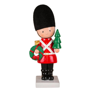 Decorazione natalizia statuetta schiaccianoci vestita in alta uniforme di colore rosso frizzante ed un alto cappello in stile pelliccia d’orso. Questa bellissima statuetta decorativa natalizia rappresenta un soldato con in mano una ghirlanda di Natale ed un piccolo albero verde nell’altra. Realizzato in resina dipinto a mano con colori vivaci e finitura lucida.