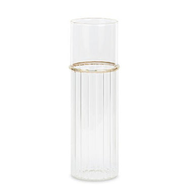 Lasciati catturare dalla bellezza di questo vaso. Dall'originale design questo pezzo è realizzato interamente in vetro, garantendo una qualità superiore e una durata senza pari. La sua trasparenza permette di esaltare al massimo il colore dei fiori o delle piante che vi metterai all'interno, mentre l'inserimento color oro aggiunge un tocco di lusso e raffinatezza. Aggiungilo al soggiorno per creare un punto focale accattivante o mettilo sul tavolo da pranzo per rendere ogni pasto speciale. Sarai sicuramente notato per il tuo gusto impeccabile e la tua attenzione ai dettagli. Che tu scelga per te stesso o come regalo, sicuramente farai colpo su chiunque lo vedrà. Non aspettare oltre, ordina ora e regala alla tua casa un tocco di stile ed eleganza.