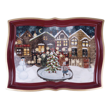 Vassoio Natalizio Rettangolare Bordo Ondulato XMas Vintage 43X31 cm: immagina un Natale avvolto in un'atmosfera calda e accogliente. Con questo elegante vassoio natalizio, potrai creare centrotavola unici. Il suo design rettangolare, dalle dimensioni generose, il bordo ondulato e l’immagine del paesaggio invernale con la neve che cade tra le case, lo rendono un oggetto decorativo davvero speciale da utilizzare durante le feste. Perfetto per presentare biscotti appena sfornati, cioccolatini gustosi o piccole servire il tè o il caffè, sorprese per i tuoi ospiti, questo vassoio XMas vintage è perfetto per le tue festività. Potrai creare composizioni natalizie uniche: abbinalo a candele profumate, pigne, rami di agrifoglio e decorazioni colorate per un centrotavola indimenticabile. Oppure, utilizzalo come base per presentare i tuoi dolci fatti in casa, trasformando la tua tavola in un vero e proprio angolo di magia.