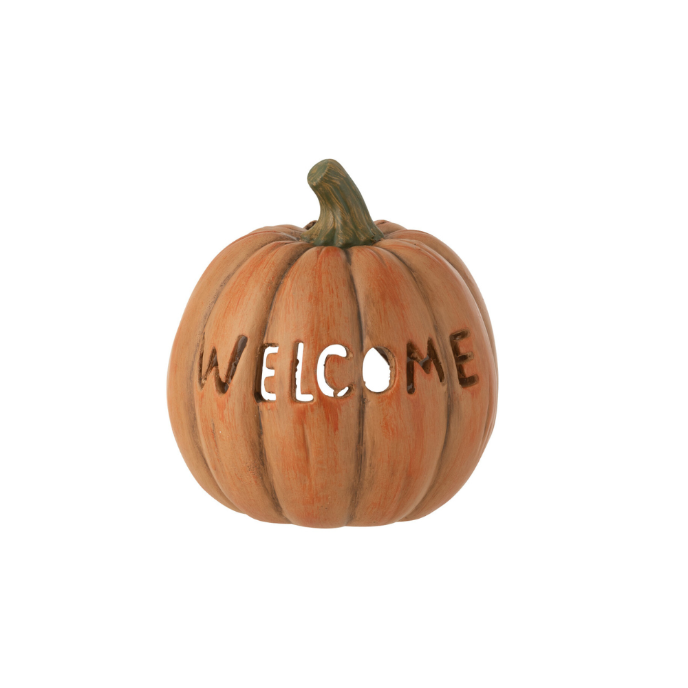 Celebra la stagione con questa suggestiva zucca decorativa in ceramica della linea "Couleurs D'Automne". Di giorno è un elegante complemento d'arredo (Ø15x16,5h cm), ma di sera si trasforma. Grazie all'apposita fessura, puoi inserire una T-light all'interno per illuminare la scritta "Welcome" intagliata, creando un'atmosfera calda, magica e accogliente. Perfetta per decorare l'ingresso e salutare gli ospiti con un bagliore di festa.